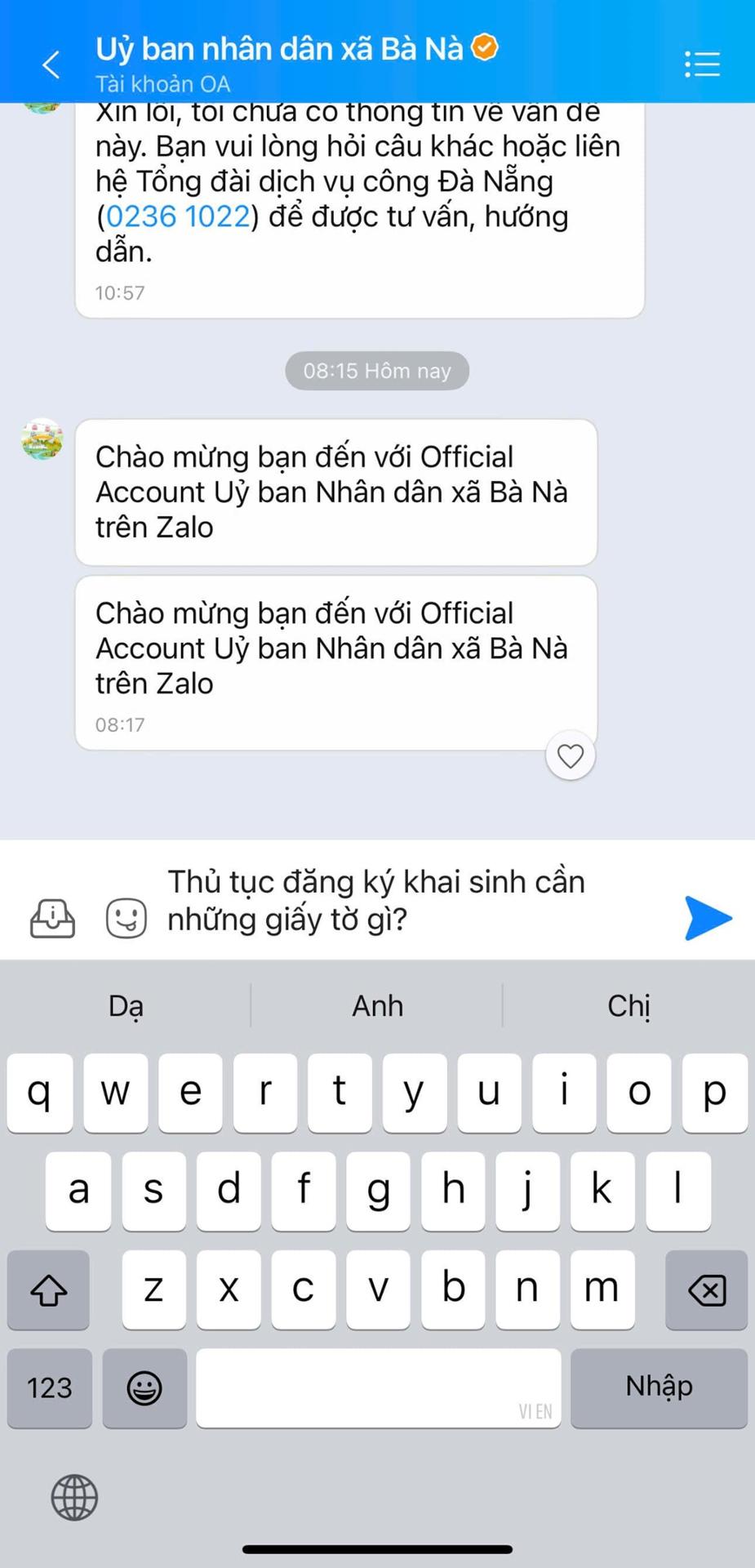 Nhằm giúp người dân và doanh nghiệp dễ dàng tra cứu thông tin, UBND xã Bà Nà đã tích hợp tính năng Chatbot AI trên trang Zalo OA chính thức của UBND xã.