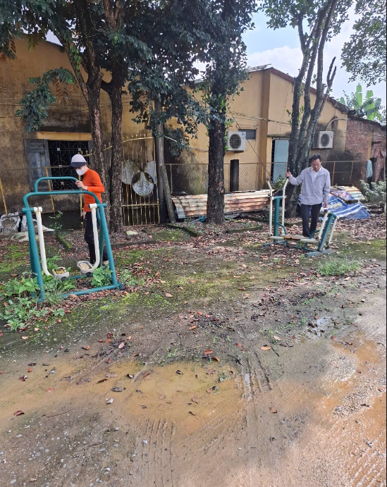 Hiện trạng sân sinh hoạt cộng đồng tại Thôn Phú Hòa 1 và dụng cụ thể thao đang bị hư hỏng gây lãng phí tài sản công