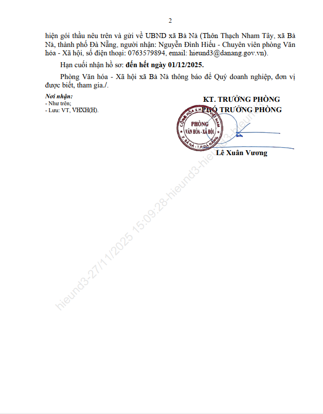 Phòng Văn hóa - Xã hội xã Bà Nà tiến hành lựa chọn đơn vị đủ năng lực, kinh nghiệm theo quy định bằng hình thức chỉ định thầu để thực hiện Xây dựng Trang thông tin điện tử xã Bà Nà do Phòng Văn hóa - Xã hội làm chủ đầu tư