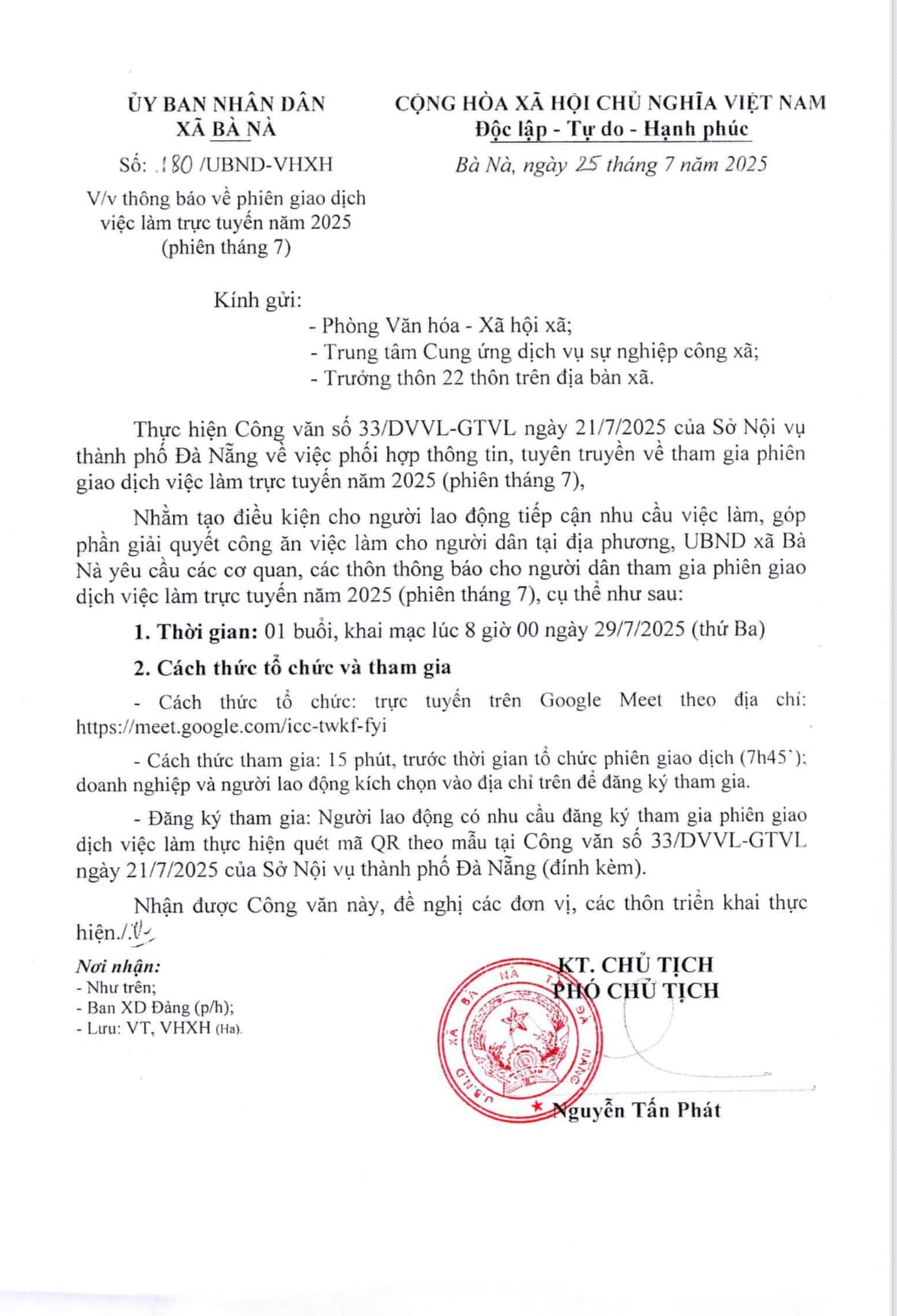 Thông báo về phiên giao dịch việc làm trực tuyến năm 2025 của Ủy ban nhân dân xã Bà Nà